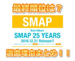 2016年12月21日発売の『SMAP25YEARS』のファン投票の最終順位をまとめました! さらに、気になった曲の選曲理由についても皆さんの声を集めてみます。SMAPやファンの気持ちがたくさん詰まったアルバム『SMAP・・・